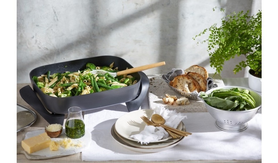 La sartén y la base son aptas para lavavajillas y están hechas con una superficie de cocción antiadherente, lo que facilita la limpieza.